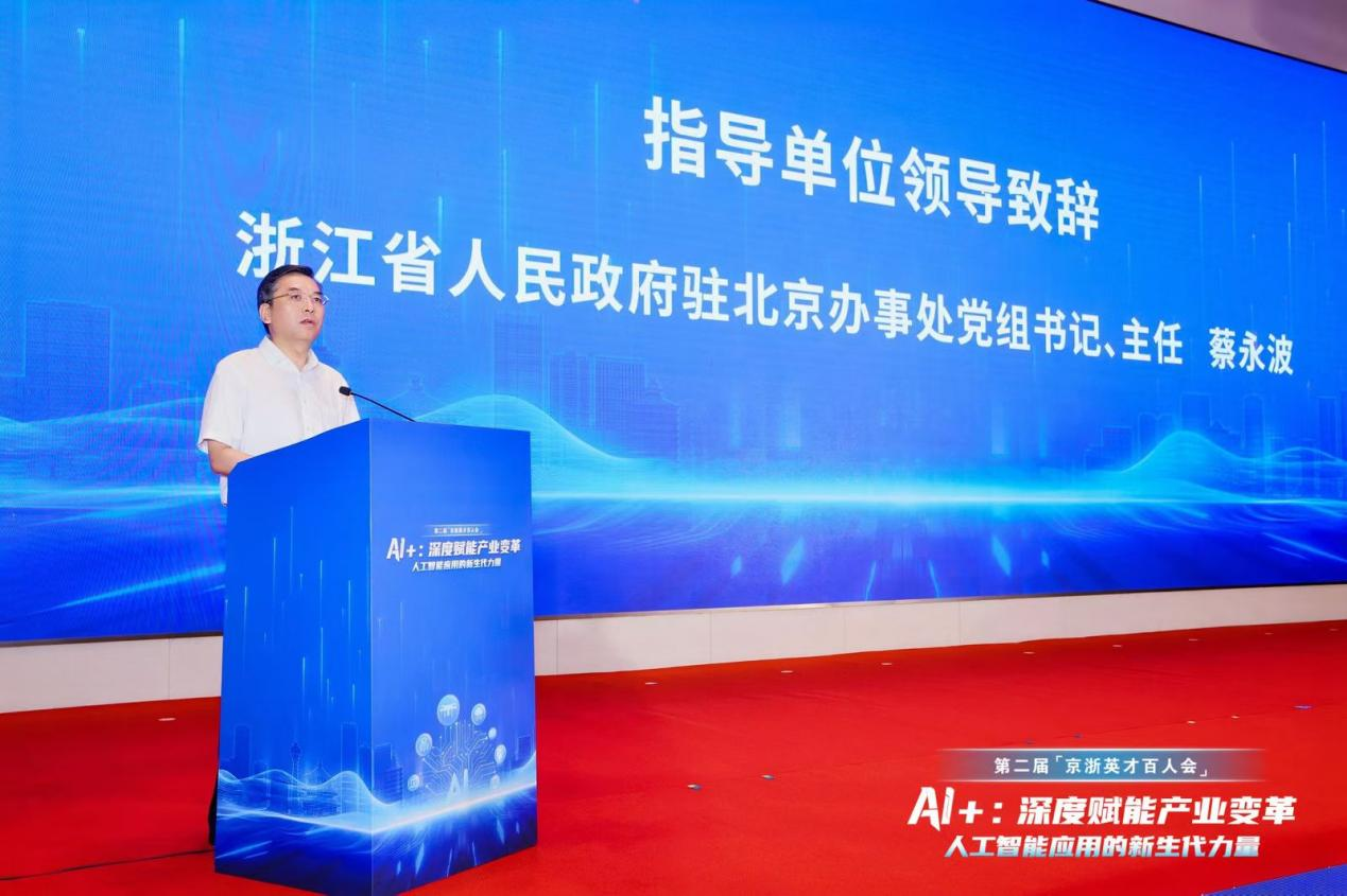 本次会议重点就是大力推动京浙区域协同创新,助力浙江抢占人工智能发展制高点,打造全球人工智能创新发展高地。浙江省人民政府驻北京办事处党组书记、主任蔡永波的致辞中表示“浙江已形成涵盖算法研发、智能硬件、场景应用的完整AI产业链,2024年产业营收达5796亿元,而北京集聚了全国40%以上的AI顶尖人才与50%以上的投融资项目,两地优势互补的协同创新潜力巨大。”